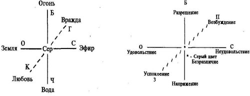 Таким образом, античная мысль вплотную приблизилась к пространственной трактовке цвета, которая сегодня может включать как внешний, так и внутренний мир (чувства — рис.36) человека. С учетом же выводов в §§ 1.5 и 2.2 можно заметить, что «бесцветные» абстракции занимают исключительно ахроматическую ось (Б — Ч), тогда как сублиматы — все пространство цветового тела (см. § 3.5.).