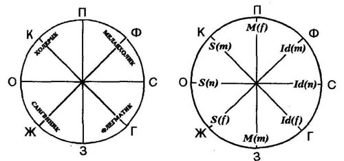 На рис.5 изображен цветовой круг как двусторонняя проекция цветового тела (рис.2) на плоскость (цветовой круг) темпераментов (рис.4), определяющих характер чувственно-эмоциональных отношений, которые коррелируют с вкладом каждого из компонентов женского (f) и мужского (т) интеллекта в соответствующий вид темперамента.
