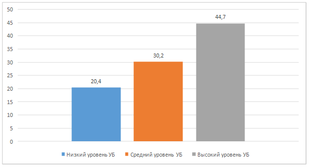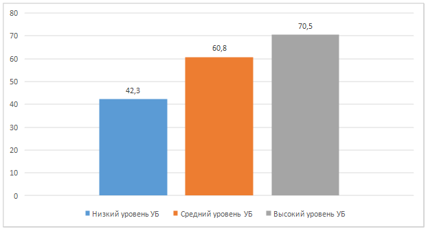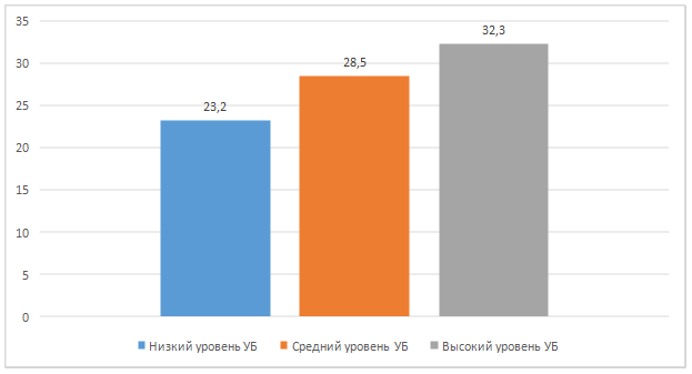 Сравнительная диаграмма показывает, что интегративный уровень эмоционального интеллекта в группе с низкой степенью УБ соответствует нижнему порогу среднего уровня ЭИ. В группе со средней степенью УБ эти показатели также находятся на среднем уровне, но приближены к верхнему порогу среднего уровня. В группе с высокой степенью УБ эмоциональный интеллект находится на высоком уровне сформированности.