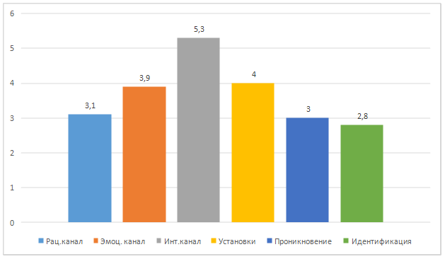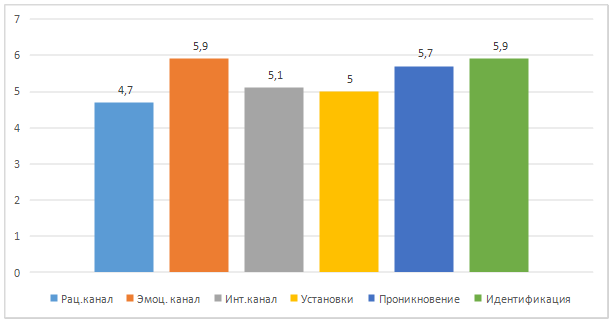 Наибольшую значимость в группе с высоким уровнем удовлетворенности браком имеют такие каналы эмпатии, как «идентификация», «эмоциональный канал» и «проникновение». Практически такие же результаты получены в группе со средним уровнем УБ. В то время как в группе с низким уровнем УБ канал идентификации с партнером показал минимальную значимость и на переднем плане выступали интуиция и личностные установки. По полученным результатам можно предположить, что чем слабее развит механизм произвольного процесса извлечения информации о скрытых состояниях объекта эмпатии (проникновение), тем значительнее это влияет на установление благополучных эмоциональных отношений в семье, и, следовательно, на ощущение удовлетворенности от брака.