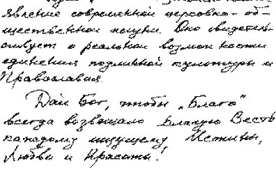 №10. Почерк — разделен, фигурист, стилизован. Колеблющийся прямой наклон. Закручивающиеся вовнутрь движения (петля и возвращающийся к центру хвостик «б», буква «с», «о» и др.). Непродуктивные с точки зрения написания, элементы и излишества ( см. «д», «у», «з», «й» и др.). Одновременно — теряющие прямоту строчки, неравномерные расстояния между ними. Нижние элементы букв «залезают» на территорию нижеследующих строк. Промежутки между словами также неравномерны, с тенденцией к уменьшению. Заполненность пространства целиком.