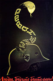 Непроизвольное и произвольное внимание часто переходят друг в друга. Так, в плакате «Люди, будьте бдительны!» (рис. 36) создана необычная композиция, способная вызвать у человека непроизвольное внимание. В процессе дальнейшего восприятия появляется желание рассмотреть внимательнее светлые пятна, образующие тело змеи. Теперь уже произвольно зритель вглядывается в них и прочитывает слово «Реваншизм». Такой композиционный прием позволяет человеку осознать, что и сегодня фашизм может представлять угрозу, если люди не будут бдительными.