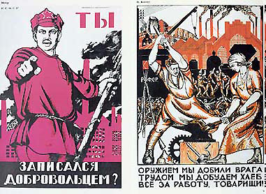 Плакаты, вызывающие непроизвольное внимание, чаще всего носят призывный, агитирующий характер композиции. Их общие черты: повышенная оригинальность, динамичность композиции, необычность формы, большая контрастность линий и цвета и т. д. Внимание, вызванное такими плакатами, осуществляется без заранее осознанной цели и не требует особой затраты волевых усилий. Оно возникает и длится до тех пор, пока человек не освоит имеющуюся в плакате смысловую и эстетическую информацию. Плакат «Ты записался добровольцем?» (рис. 33) вызывает непроизвольное внимание. Указательный палец и суровый взгляд красноармейца непрерывно следует за зрителем.