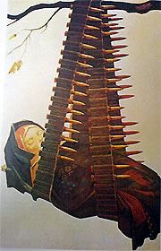 Зритель видит ребенка, безмятежно спящего на доске-люльке. Переключив затем внимание на пулеметную ленту, он с грустью улыбнется находчивости родителей-партизан, необычным образом применивших (во имя жизни) средство уничтожения врага. Ветвь дерева привлечет к себе внимание тем, что покажется зрителю ненадежной конструкцией для сохранения ребенка. Тем самым эта часть композиции становится важным звеном последовательности переключения внимания.