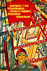 В плакате «Всесоюзная. Комсомольская. Ударная» (рис. 41) ритмико-пропорциональный строй композиции создает условия прежде всего для появления переключения внимания. Взор человека следует ритму слов, затем переключается с флага на лицо рабочего или наоборот, в любой очередности. С другой стороны, равномерная распределенность единых по стилю пластического выражения элементов конструкции стройки, их равноценность способствуют появлению распределенного вида внимания. Сосредоточивается внимание в центре композиции, затем переключается для более внимательного изучения на неотчетливо изображенную фигуру рабочего.