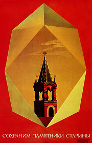 В плакате «Сохраним памятники старины» (см. рис. 47) проводится параллель между структурой архитектурного сооружения и структурой кристалла. В их соединении возникает структурность целого, которая придает иной, новый смысл этим элементам композиции. Башня Кремля теперь предстает перед зрителем как драгоценный камень, бриллиант из короны древнерусской архитектуры, а небольшой по своим размерам кристалл наделяется качеством монументальности.