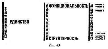 Композиционные принципы, в свою очередь, раскрываются композиционными средствами. Их названия родственны своим принципам. Например, принцип функциональности есть взаимодействие функций каждого элемента композиции. Точно так же принцип структурности представляет собой взаимодействие структур всех элементов композиции (рис. 43).