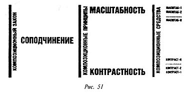 Композиционный закон соподчинения упорядочивает все смысловые и формообразующие стороны композиции в соответствии с их значимостью в произведении. Действует также на основе всех композиционных принципов, но имеет и свои, которыми являются масштабность и контрастность, как это показано на схеме (рис. 51).