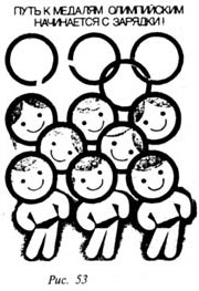 Суммарное взаимодействие всех отдельных контрастов создает контрастность композиций, всего целого. Контрастность плаката в целом может быть высокой, намного большей, чем контрастность рассмотренного примера с аистами. Она может быть еще более низкой, чем в плакате «Путь к медалям олимпийским начинается с зарядки!» (рис. 53).