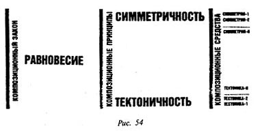 Композиционный закон равновесия осуществляется в процессе реализации его принципов — симметричности и тектоничности с помощью композиционных средств: различного вида симметрии и разных форм тектоник, как это показано на схеме (рис. 54).