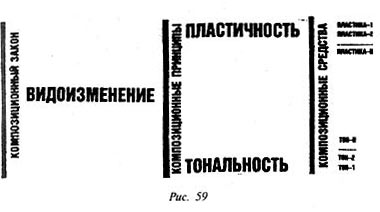 Закон видоизменения определяет меру всех изменений внутренней структуры и формы поверхности (контура, цвета), устанавливает для них качества родства, согласованности. Это закон материализации замысла, перевод его из понятийно-вербального вида в зримую форму. Причем это такое «овеществление» замысла, когда главная мысль произведения по-своему повторяется во всех частях формы. «Большое» отражается в «малом» — так можно кратко охарактеризовать важнейшую особенность этого закона. Реализуется закон видоизменения прежде всего на основе композиционных принципов пластичности и тональности (рис. 59).