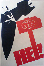 Зритель имеет хорошее представление о пластике (хотя бы на интуитивном уровне) почти любого изображенного в плакате предмета. Из имеющегося опыта зритель создает свое представление о соответствии пластики изображенного предмета реальной действительности. Этим пользуется художник, чтобы лучше раскрыть замысел произведения. В одном случае он показывает изменения предмета, не создающие у зрителя впечатления разрушения формы. В другом случае он изображает пластику такой, что не оставляет у зрителя сомнений в безвозвратном изменении формы. Например, в плакате «Нет!» (рис. 60) изображены изменения двух «непластичных» элементов композиции. Удар молота (усилий всего прогрессивного человечества) вызвал необратимые изменения формы бомбы (военных устремлений милитаристских кругов, капиталистического мира). При этом в движении сторонников мира также имеются пусть незначительные, но необратимые потери. Диалектику этого столкновения художник передал посредством скола формы в восклицательном знаке. Отметим, что места разрушения формы расположены на противоположных концах диагонали композиции.