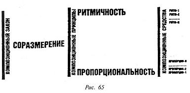 Закон соразмерения устанавливает количественные соотношения между всеми свойствами элементов композиции и целым. В гармоничной композиции такими мерами являются закономерности — ритмичность и пропорциональность, как это показано на схеме (рис. 65). Ритмичность и пропорциональность в своем взаимодействии создают тонкую числовую настройку между элементами композиции и целым. В результате согласования всех размеров образуется гармония, которая облегчает процесс восприятия, увеличивает его длительность.