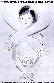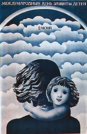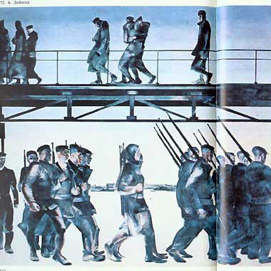 Политический плакат относится к изобразительному искусству. Поэтому в нем нередко встречаются композиционные приемы, характерные и для станковой живописи. Композиционный прием, использованный в картине «Оборона Петрограда» художником А. Дейнекой (рис. 72), оригинально применен в панно для оформления завода (рис. 73). Но механическое совмещение фрагментов, взятых из различных произведений, — не творческий путь создания нового плаката (рис. 74). Часть композиционного приема, примененного в картине «1919 год. Тревога» художником К. Петровым-Водкиным (рис. 75), нашла выражение в плакате «Пусть будут счастливы все дети!» (рис. 76).