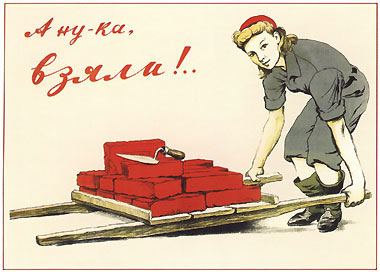 В плакате «Комсомол — ударная бригада пятилетки» (рис. 57) в художественной форме изображены тектоника перемещения тяжести на катках (вагонетки) в одном направлении и тектоника консольно нависшей тяжести двутавровых конструкций в противоположном направлении. Посредством этих противодействий создается напряженность художественного образа, отражающая динамику-физического труда, характерного для строек первых пятилеток.
