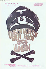 Композиционный прием, в котором реальная часть изображения заменяется другими элементами, умело использован в плакате к кинофильму «Обыкновенный фашизм» (рис. 83). Одна из эмблем фашизма — череп — передается в плакате с помощью шрифта текста. Изменения шрифта — придание буквам «О» сходства с ушами — и другие его трансформации, а также реалистическое изображение фуражки относятся не к композиционному приему, а к способу создания художественного образа.