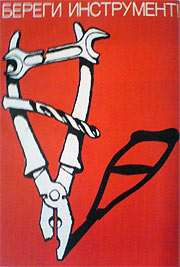 Функциональность раскрывается художественным образом плаката. Найти образ, адекватный функции,— нелегкая задача, которую не всегда удается решить. Иногда малозаметная подмена функции плаката, выраженная текстом, функцией, раскрываемой художественным образом, ведет к несогласованности между текстом и художественной формой произведения. В плакате «Береги инструмент» (рис. 50) показаны пришедшие в негодность инструменты, что само по себе может быть естественным итогом их износа. Но не раскрывается тема бережливости, обозначенная в тексте. Изображение покалеченного инструмента представляет собой лишь формальную аналогию темы бережливости и фактически нацелено на то, чтобы вызвать у зрителя реакцию жалости к «несчастному» инструменту.