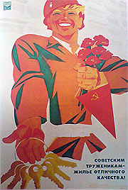 Пластика иного характера показана в плакате «Страна родная, принимай наш казахстанский каравай!» (рис. 61). Под воздействием степного ветра одежда девушки принимает мягкие, волнообразные изменения, напоминающие колыхания пшеничного поля. Округлая форма хлеба — главного элемента композиции, ритмические колебания одежды создают у зрителя представление о стабильной цикличности, вызывая ассоциации и о стабильности получения высоких урожаев на казахстанских полях. Так пластика композиции стала одним из главных средств выражения содержания плаката.