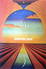 Плакат «Мелиорацию — полям!» (рис. 117) построен, главным образом, на трех видах ритма. Один из них, образованный из перспективно сходящихся прямых линий возделанного поля, составляет основу композиции. Другой представляет собой арку, созданную из колосьев урожая. Третий ритм является сложносоставленным чередованием синих пятен неба, облаков, звезд и луны с ее отражением.