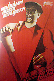 Рассмотрим теперь ритм в связи с задачей организации внимания в композиции плаката. В качестве примера выберем плакат «Молодым нести эстафету!» (рис. 118). Ритм композиции — острый угол, образованный направлением оси отбойного молотка и линией, рассекающей лист плаката по диагонали. Этим приемом создается ритмическое напряжение в острие угла, где помещена дата зарождения стахановского движения в нашей стране — 31 августа 1935 года. В противоположном направлении происходит разряжение ритмического движения. Однако эта часть композиции не ослаблена, так как голова шахтера усилена контрастом света и тени. Тем самым оба конца ритмического ряда приобрели почти равное значение. Внутри угла-ритма оставлено пустое пространство, которое (как ритм) способствует продвижению по нему взора.