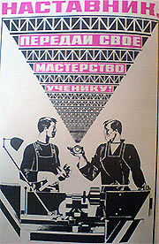 В плакате «Наставник, передай свое мастерство ученику!» (рис. 122) явно выраженный ритм получен за счет чередования строительных конструкций и расположенного на них текста. Этот ритм берет свое начало в центре композиции. И внимание человека стремится именно туда, к центру симметрии. С другой стороны, внимание, как показали эксперименты, привлекается сначала большим элементом ритма, a от него как бы скользит в направлении меньшего элемента. Тем самым при восприятии ритма этого плаката происходит борьба двух противоположно действующих, «конкурирующих» факторов. Один из них фокусирует внимание зрителя в центре, на детали, которую держит в руке наставник. Другой действует в ином направлении, привлекая внимание к слову «Наставник». Этот элемент ритма усилен к тому же красным цветом.