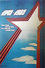 В плакате «1945—1985. Звезда Победы, сияй над всеми...» (рис. 123) использован аналогичный художественный прием. В этой композиции главную роль играет ось, образованная активным направлением центрального луча звезды. Здесь также имеется два конкурирующих фактора ритма. Схождение угла звезды, завершаемое на краю плаката, «притягивает» взгляд вверх. Но ритм облаков, начиная с большего элемента (нижнего облака), стремится «перетянуть» внимание зрителя в свою сторону, что несомненно удается. Внутри луча звезды внимание непрестанно переводится вверх-вниз. В результате такого противоборства фокусов притяжения взор укрепляется в центре плаката, точнее, в центре поля зрительного восприятия, которое немного выше точки пересечения диагоналей — центра симметрии. От точки оптического центра композиции влево расположен второй луч звезды, который ведет к тексту плаката. После прочтения текста взор вновь утверждается в визуальном центре листа, где внимание сосредоточивается на глубине ясного неба.
