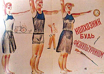 В плакате «Колхозник, будь физкультурником!» (рис. 116) очевидна метрическая основа композиции. Метр, который может состоять как минимум из трех элементов (лучше из четырех, так как между четырьмя элементами возникает еще один метр — три интервала между элементами), проявляется здесь в двух видах. Прежде всего, это три физкультурника (однородный метр), затем три разнородных элемента, составленные в ряд через почти равные интервалы: трактор; колхозник, стоящий на втором плане, и третий элемент, составленный из различных предметов и шрифта. Если подойти ко второму метру более строго, то можно обнаружить, что он им не является, так как представляет собой уже ритм. Действительно, в нем происходит постепенное изменение (увеличение) размеров элементов. Кроме того, последний элемент этого метра является в своей главной части также ритмом, так как он создан из расходящихся слов. Сложные ритмы имеются также в фигурах колхозников. Все это показывает, насколько трудно вычленить отдельные метры, хотя это простейшие виды ритма.