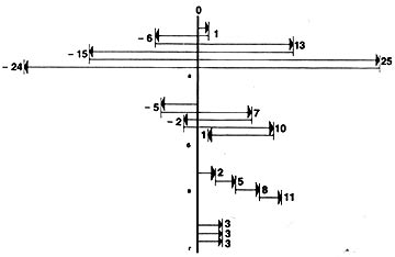 В математическом смысле ритмом можно назвать любую последовательность чисел, которая в явном или неявном виде содержит метр, состоящий не менее чем из трех элементов. Обнаружение в последовательности скрытого метра осуществляется с помощью одноразового или повторяющегося вычитания, если последовательность состоит из положительных чисел, и сложения каждых двух смежных чисел последовательности, если в ней есть отрицательные числа. Например, если взять первую разность между смежными числами последовательности: 3, 4, 8, 1, 11, то получим числа 1, 4, 7, 10. Вторая разность между числами новой последовательности образует метр: 3, 3, 3. Выполним аналогичные операции на последовательности: 1, -6, 13, -15, 25, -24. Тогда получим следующую алгебраическую сумму: -5, 7, -2, 10, 1. Вторая сумма образует новую последовательность: 2, 5, 8, 11. Очевидно, эта последовательность содержит в себе метр: 3, 3, 3. Представим эту операцию в графическом виде (рис. 119).