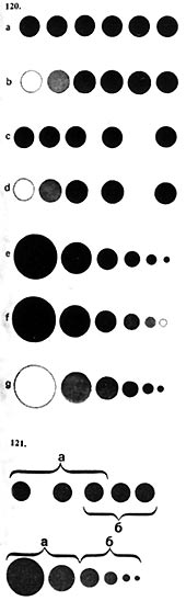 Всего в экспериментах изучалось семь ритмов (рис. 120): а) простой метр; б) метр с закономерным изменением светлоты тона его элементов; в) ритм, образованный изменением интервалов между элементами; г) ритм с закономерным изменением интервалов и светлоты его элементов; д) ритм, полученный в результате изменения величины элементов; е) ритм, в котором закономерно изменялись величина элементов и их светлота от большего темного к меньшему светлому; ж) ритм, в котором изменялись величина элементов и их светлота от большего светлого к меньшему темному.