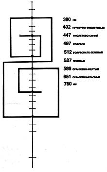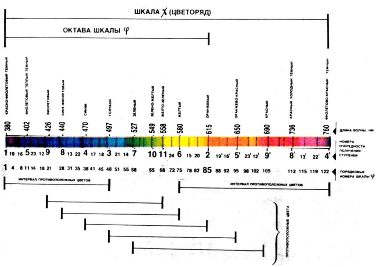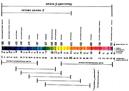 В разделе о пропорциях было показано, что шкала золотых отношений (шкала φ) является надежной основой для поиска гармоничных пропорций. Соотнесем главные ступени шкалы золотых отношений с градациями светового спектра — длинами волн его цветовых зон.