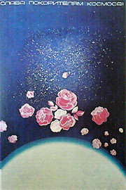 В работе «Слава покорителям космоса!» (рис. 128) высокопрофессиональное владение цветом. Последовательное уменьшение площади светлых тонов (поверхность Земли — парящие в невесомости цветы — дальние звезды) создает определенный ритм цвета. Космос показан не черным, каким он предстает перед взором космонавтов, а темно-синим, как бы окрашенным атмосферой Земли. Такой цвет способен выразить большую глубину пространства, чем черный. Цвет воспринимается человеком как глубокий цветовой тон благодаря высокой насыщенности (чистоте, близости к спектральному цвету). По краю Земли сделана растяжка синего цвета на несколько его оттенков, что соответствует действительности и придает серому цвету теплоту. Контраст синего с розовым (цветы) также смягчен с помощью растяжки, но только розового тона. В плакате хорошо сбалансированы цвета и по признаку теплохолодности. Синие, самые холодные цвета в спектре дневного света, стали теплее с помощью «горячего» красного тона, который скоординирован с синим тем, что стал ближе к нему по теплохолодно-сти, приблизился к пурпурному. Так же умело найдена теплохолодность серого тона. Он в меру теплый и одновременно холодный, то есть точно определен в системе всей цветовой композиции.