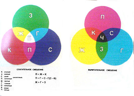 Вычитательное смешение цветов используется в искусстве плаката, живописи и т. д. На рисунке (рис. 131) показано, что оба вида смешения взаимно дополняют друг друга. Так, три первичных цвета слагательного смешения (красный, зеленый, синий) в попарном соединении образуют три основных цвета вычитательного смешения (желтый, голубой, пурпурный).