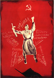 В определении цветового строя плаката нельзя заранее сказать, что большей насыщенностью обладают те формы, которые находятся в центральной, то есть главной, части композиции. С помощью цвета возможно изменить акценты композиции. Например, в плакате «Победа!» (рис. 133) насыщенным красным цветом выполнен фон, так как он стал носителем наибольшего количества информации. Советский воин-победитель изображен менее насыщенным цветом, так как в информационном плане он более понятен зрителю. Здесь произошла нередкая для композиции инверсия, перестановка акцентов: фигура солдата, несмотря на то что является главным, центральным элементом композиции, подчинена фону в цветовом отношении. Тем самым значимости функции фигуры и фона выравнялись, все соединилось в неразрывное единство, целостность художественного образа.