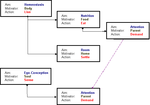 В ходе реализации собственных потребностей каждый субъект развивает уникальный мотивационный портрет. На его формирование влияют как собственные индивидуальные психо-физиологические характеристики субъекта, так и окружающие условия, в которых происходит удовлетворение им своих потребностей. Именно мотивационный портрет определяет интенциональность поведения живого существа (или его модели). Основное формирование этого мотивационного портрета происходит в раннем возрасте, хотя эволюция его узлов и перестройка связей между ними не прекращаются до самой смерти субъекта. Влияние же этого комплекса на поведение начинается с самых первых дней жизни субъекта. Все то, что в дальнейшем определяет поведенческие паттерны субъекта, управляется его уникальной Ego-концепцией, сформированной на материале его индивидуального опыта.