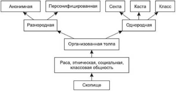 Третий вид толпы — организованная, или одухотворенная, толпа. Организованная толпа в свою очередь делится на два типа. Во-первых, это толпа разнородная, которая может быть анонимной (например, уличная толпа) и персонифицированной (например, присяжные заседатели, парламентские собрания). Во-вторых, существует толпа однородная, которая бывает трех категорий.
