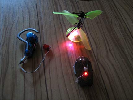 Игровые приемы тренинга реализуются путем осуществления целенаправленных касаний миниатюрного летающего устройства ( см. фото) к намеченным зонам потолка при его взлете и последующем снижении. Для этого требуется осуществление прецизионных перемещений органов управления дистанционного ручного пульта (тонкой моторики рук). Органы управления дистанционного пульта армированы гальваномагнитным стимулятором, что позволяет в процессе управления траекторией полета пропеллерного устройства одновременно осуществлять и приемы латеральной гальваностимуляции для формирования эффектов целенаправленного влияния на вегетативное равновесие пользователя (левополушарная стимуляция активирует симпатическую и угнетает парасимпатическую части вегетативной нервной системы / Чуприков А., 1987/ ). Для этих же целей используются приемы монауральной аутосуггестии (с помощью закрепленной на заушнике акустоэлектронной системы) и латеральной мышечной импульсации (при перемещении соответствующей рукой подпружиненных органов управления пульта для дистанционного целенаправленного влияния на траекторию полета пропеллерного устройства). Следует отметить, что эффект контрлатеральной реакции головного мозга на поочередное мышечное стимулирование левой и правой кистей рук экспериментально подтвержден с помощью метода радиотеплового сканирования (Годик Э., 2000).