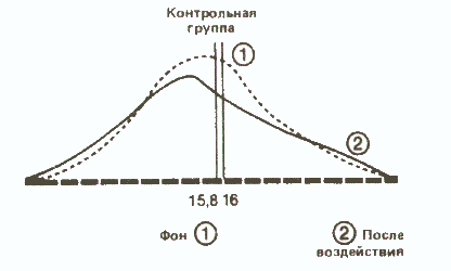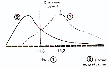 Видно, что в контрольной группе разница между средними обоих распределений невелика, и поэтому можно думать, что обе выборки принадлежат к одной и той же популяции. Напротив, в опытной группе большая разность между средними позволяет предположить, что распределения для фона и воздействия относятся к двум различным популяциям, разница между которыми обусловлена тем, что на одну из них повлияла независимая переменная.