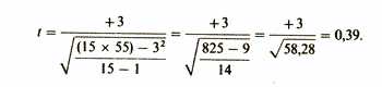 Сверившись с таблицей значений t, мы можем прийти к следующим выводам: полученное нами значение t=0,53 меньше того, которое соответствует уровню достоверности 0,05 для 26 степеней свободы (h)= 28); следовательно, уровень вероятности для такого t будет выше 0,05 и нулевую гипотезу нельзя отбросить; таким образом, разница между двумя выборками недостоверна, т. е. они вполне могут принадлежать к одной популяции.