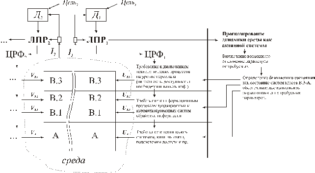 У субъекта защиты изначально есть некая цель, на основании которой с учетом параметров среды (I) формируется доктрина (Д). На основании информации об обстановке I и доктрины лицо, принимающее решение (ЛПР — субъект безопасности) формирует целевой режим функционирования системы (ЦРФ). Кроме этого ЛПР необходимо прогнозировать динамику среды как пассивной среды: пассивной, т.к. в условиях отсутствия конфликта мы исключаем из рассмотрения свободные информационные системы, которые можно рассматривать как активные элементы. Способность ЛПР найти оптимальный ЦРФ, удовлетворяющий конечной цели, а так же спрогнозировать вероятные угрозы, характеризует информационную безопасность субъекта по пункту B. На основании прогноза выявляются возможные отклонения функциональных характеристик подсистем от целевого режима функционирования и вырабатываются управляющие воздействия на каждую из подсистем (UB.3 … UA). Если такие управляющие воздействия можно осуществить, то система информационно безопасна в соответствии с пунктом A.