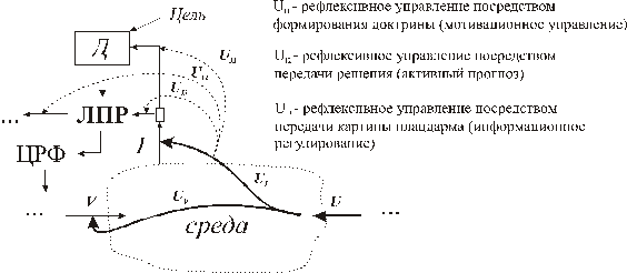 - Информационное (рефлексивное) управление (UI) — управление информацией, которую использует контрагент при принятии решений. В нашем случае его условно можно разбить на мотивационное управление[2] (UI1), активный прогноз (UI2) и информационное регулирование (UI3).