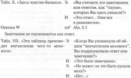 Например, табл. II: «Две собачки на задних лапах, которые касаются друг друга носами». Основная оценка 1,0 (популярный ответ) + 0,5 за позу на задних лапах + 0,5 за «носы» + 0,5 за организацию (видит собак в связи друг с другом) = 2,5; табл. II, промежуточное белое центральное пятно и серый участок над ним: «Большой толстый белый кролик, а вот его уши». Основная оценка 1,5 + 0,5 за «белый» + 0,5 за «толстый» («уши» уже входят в концепцию кролика) = 2,5.
