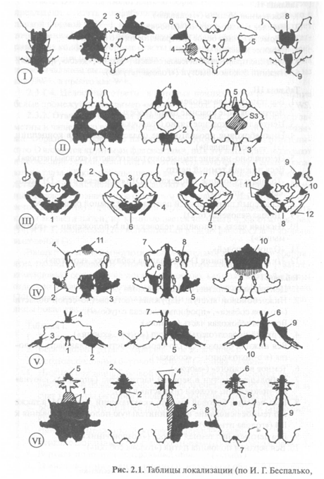 Ввиду отмеченной многими исследователями зависимости восприятия таблиц Роршаха от этнического фактора Лосли-Устери [188] рекомендовала составление локализационных карт для каждой страны отдельно. В нашей стране такая работа была проведена И. Г. Беспалько [20]. Ниже приводится составленный им список D, а на рис. 2.1. — таблицы локализации.