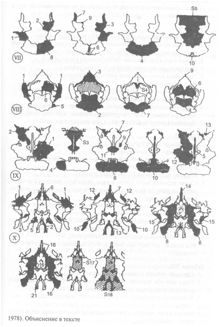 2.9.10. Сексуальные ответы. Таблицы Роршаха содержат целый ряд деталей, напоминающих мужские и женские гениталии. Чаще всего сексуальные ответы даются на следующие детали: табл. I, центральная верхушечная часть («грудь», «vagina»); табл. II, нижнее красное пятно («vagina»), верхнецентральная коническая область («penis»); табл. III («penis» и «грудь» у человеческих фигур); табл. IV, самая верхняя центральная область («vagina»); табл. VI, верхняя центральная продолговатая часть («penis»); табл. VII, темная нижняя центральная часть («vagina»); табл. VIII, более светлые центральные части основания («vagina»); табл. X, самый верхний темный центральный «столб» («penis»). Перечисленные ответы вошли в список десяти «популярных сексуальных ответов» Show (цит. по: [251]).