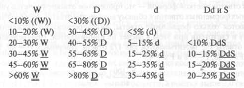Чистые D- и Dd-типы встречаются исключительно редко, в то время как чистые W-типы не редкость. Различают W+ - тип, где большинство ответов имеют хорошую форму, и W-тип. Последний является признаком грубой патологии. При оценке типа восприятия важно учитывать общее количество ответов. Низкий D% редко встречается в длинном протоколе, а высокий Dd% имеет особенное диагностическое значение в короткой записи [251].
