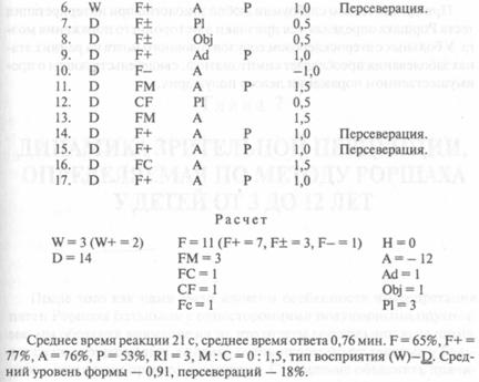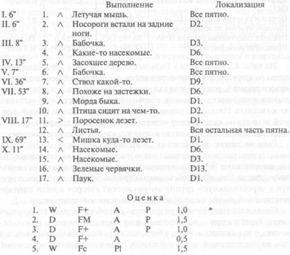 Эти данные подтвердили описанные Шаудером [236] особенности восприятия пятен при эпилептическом слабоумии: уменьшение общего числа ответов до 13-14, увеличение среднего времени ответа до 1,5 мин., отсутствие ответов по движению или наличие не более одного такого ответа, увеличение количества целостных ответов, коартированный или экстратензивный тип переживания, снижение процента ответов с четкой формой, повышение удельного веса ответов по животным и большое количество персевераций.