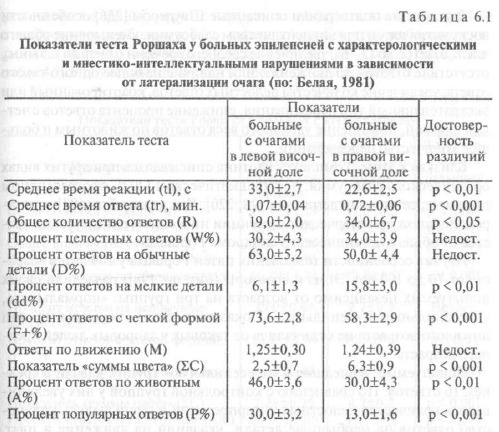 Больные с правосторонними очагами отличались повышенной двигательной активностью и эмоциональной возбудимостью, демонстративностью, переоценкой своих возможностей и недооценкой тяжести своего заболевания. При исследовании тестом Роршаха они давали много ответов, сравнительно часто выделяли мелкие детали и фрагменты фона. Ухудшалось восприятие формы пятен, появлялись конфабуляторные ответы. Резко возрастало число указаний на цвет, вследствие чего тип переживания становился экстратензивным. Указанные различия в восприятии пятен Роршаха, определяемые латерализацией эпилептического очага, приведены в табл. 6.1.