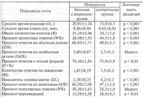 Таблица 6.2. Показатели теста Роршаха у больных с атеросклерозом
