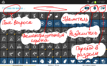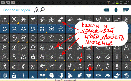 1. Ее можно применять в теоретических целях, как систематизированную книгу. При нажатии и удержании конкретной иконки открывается ее значение и подробное описание. Таким образом вся статика языка жестов у тебя под рукой...Изучай!