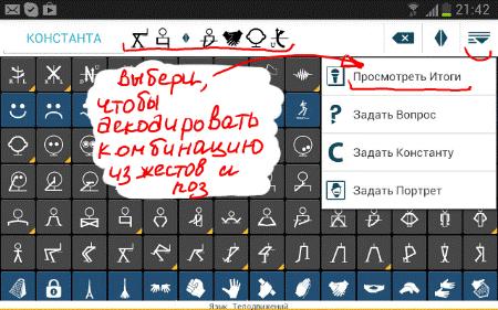 2. Для практического применения используется «демонстрационная панель». Тоесть ты видишь или наблюдаешь конкретную комбинацию жестов в совокупности с определенной позой, но тебе не ясно, что бы это значили или, как это интерпретировать? В таком случае зафиксирую увиденное путем набора соответствующих иконок (клавишь клавиатуры), потом выбери «Смотреть итог»... Таким образом тебе не придется ломать голову чтобы понять смысл жестов, декодер от Kyuda Keyboard сделает это за тебя, а ты получишь готовый результат. Более подробно -> смотри Вариант применения (на примере переговоров)