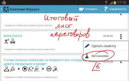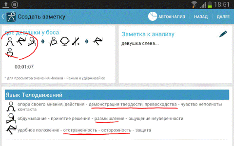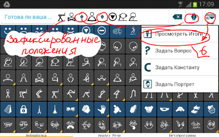 5. Итак, наши переговоры по дистрибуции начались. Мы задаем подготовленные вопросы (нам никто не откажет их смотреть со своей записной книжки или как в нашем случае с планшета), делаем себе заметки, а между делом фиксируем все движения всех частей тела собеседников (имеется ввиду, позы, жесты), которые попадут в наше поле зрения, вплоть до того, что отмечаем, кто в данный момент говорит мы или он. Фиксируемое нами отображается в демонстрационной строке и в фоновом режиме записывается на итоговый лист данной коммуникации. Тут мы рекомендуем каждый переход от одной позы собеседника к другой, а также переход от одного заданного вопроса к другому отмечать специальным <Разделителем>, который размещен вверху экрана, с правой стороны демонстрационной строки